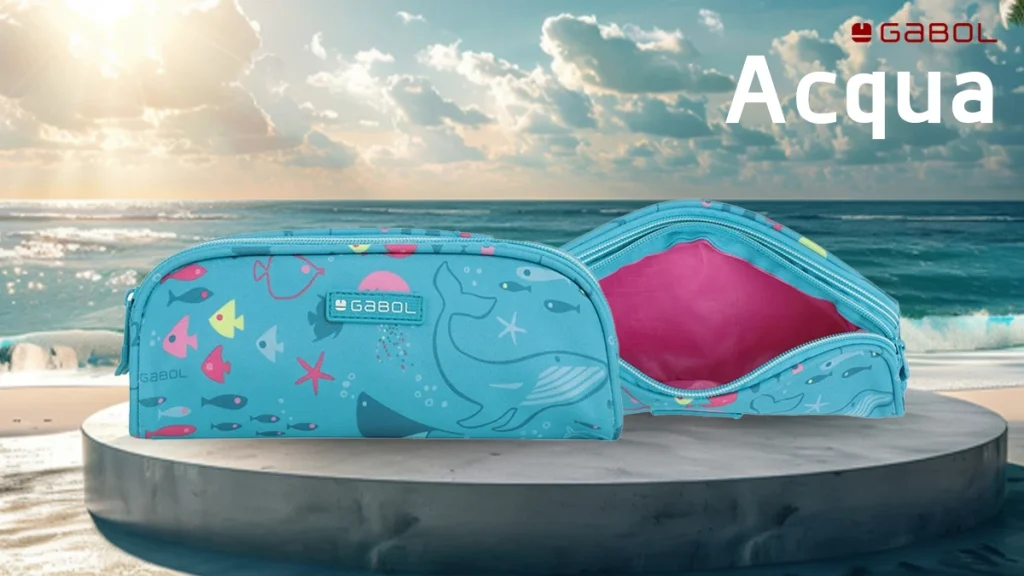 جامدادی دو زیپ از کالکشن Acqua با پسزمینه فیروزهای و نقشهای ماهیهای زیبا، مناسب برای استفاده در مدرسه جهت ساماندهی وسایل و لوازم تحریر؛ طراحی دلنشین مناسب دختران دانشآموز.