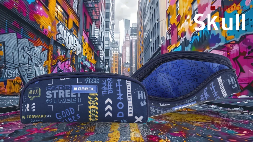 جامدادی دو زیپ از کالکشن Skull با پسزمینه آبی دیپلمات و المانهایی از خیابان که حس پویایی و حرکت را به دانشآموزان منتقل میکند. مناسب برای استفاده روزمره در مدرسه و نگهداری منظم لوازم تحریر.